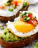 Sliced turkey with fresh avocado, english muffin, home fries topped with two poached eggs covered with hollandaise.
